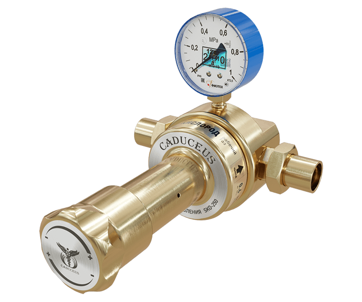 Кислородный сетевой регулятор CADUCEUS СКО-250 – это устройство, используемое для понижения давления кислорода с показателей находящегося в трубопроводной магистрали газа до нужного уровня и автоматического поддержания заданных значений.