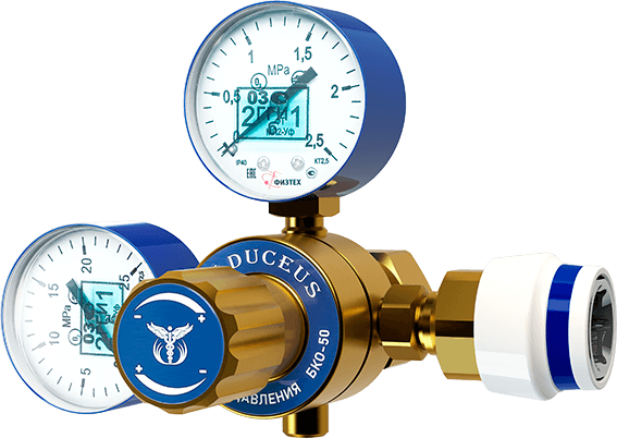 Редуктор кислородный CADUCEUS БКО-50 с быстроразъемным соединением стандарта DIN 13260-2 – это устройство, применяемое для понижения давления кислорода, поступающего из баллона, до заданного значения и поддержания его на постоянном уровне.