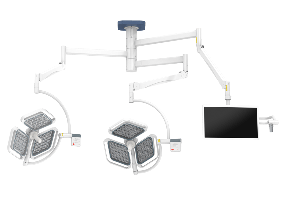 Хирургические светильники CADUCEUS CL3-L3/L3 оснащены тремя поворотными плечами с установленными на них двумя трехлепестковыми куполами и монитором и оснащены простой системой управления, позволяющей оперативно настраивать диаметр, интенсивность и фокусировку светового поля, а также подключать световые режимы «эндо», требуемые для проведения определенных хирургических вмешательств. Механическая система вращения, адаптивная под руки хирурга, позволяет регулировать высоту и местоположение осветительных куполов и монитора в любой точке пространства.