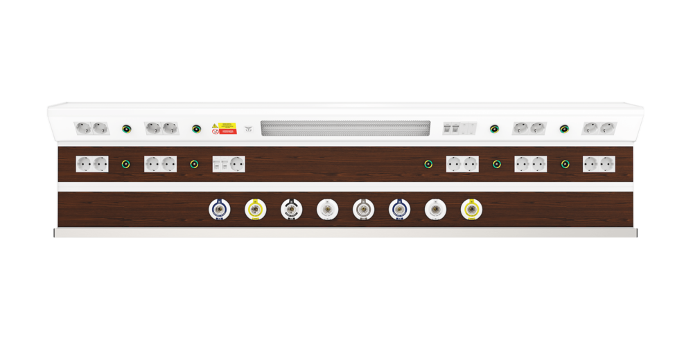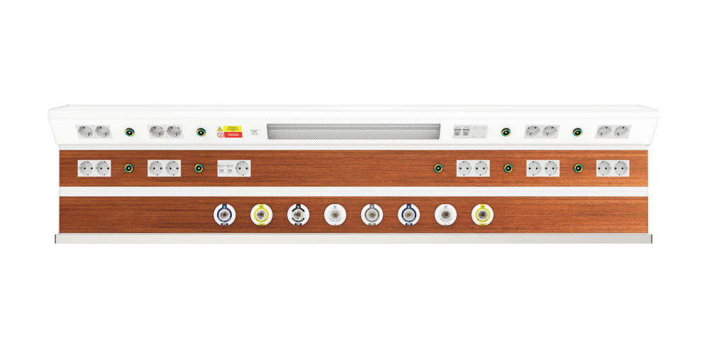 Настенные консоли CADUCEUS CN4 могут быть оснащены разъемами быстрого соединения медицинских газов, электрическими розетками 220В, выключателями освещения, коммуникационными разъемами для связи «сестра-пациент» и передачи данных, а также разными типами светильников верхнего, прямого, ночного освещения и медицинским рельсом для крепления различного медицинского оборудования (полок, зажимов, держателей штанги, ламп обсервационных с гибким штативом и пр.).