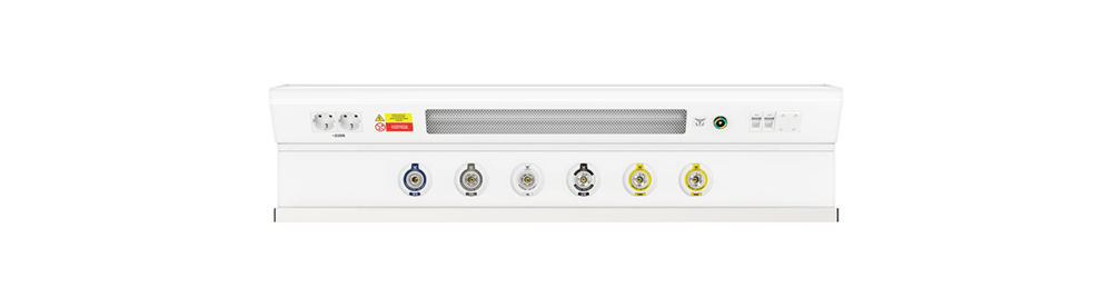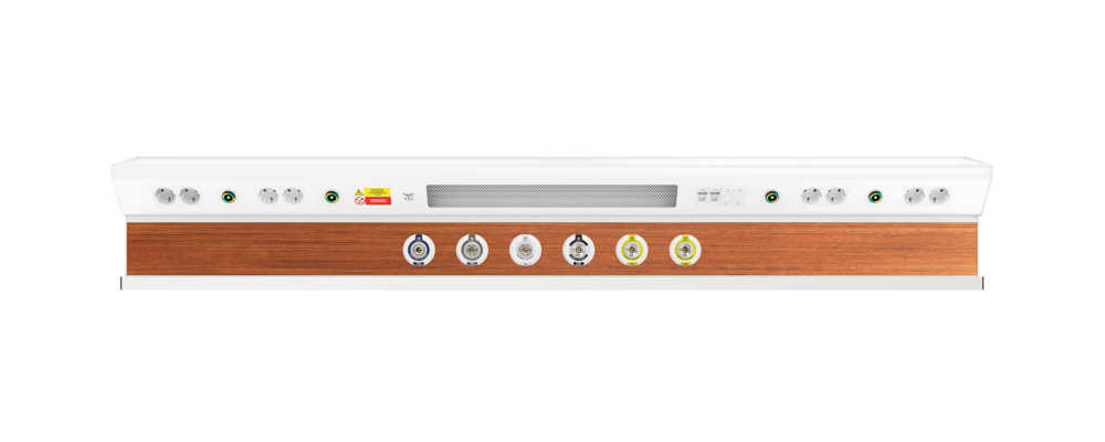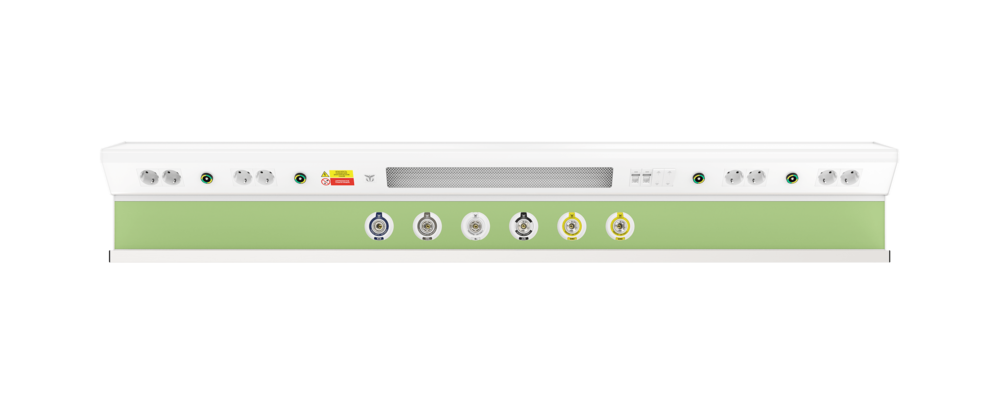 Настенная консоль CADUCEUS CN2 сочетают в себе принципы эргономичного использования пространства и может быть укомплектована разъемами быстрого соединения медицинских газов в количестве до 6-ти по стандарту DIN 13260-2 (кислорода, вакуума, сжатого воздуха, закиси азота и углекислого газа), электрическими розетками 220В и выключателями освещения, коммуникационными разъемами для связи «сестра-пациент» и передачи данных, а также разными типами светильников верхнего, прямого, ночного освещения. Медицинский рельс дает широкие возможности для крепления различного медицинского оборудования (полок, зажимов, держателей штанги, ламп обсервационных с гибким штативом и пр.).