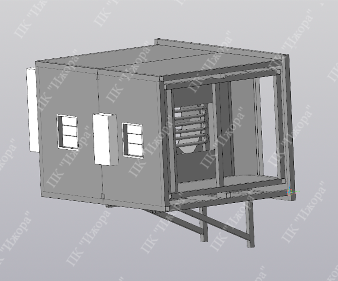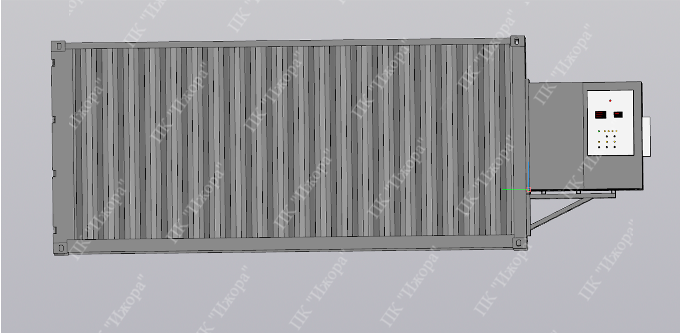 Сушильный блок устанавливается на заднюю торцевую часть предварительно утепленного морского контейнера, или другое помещение заказчика. Система работает по конвективному принципу, где нагретый воздух циркулирует по всему объему контейнера.