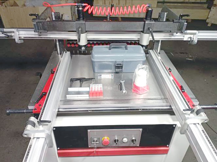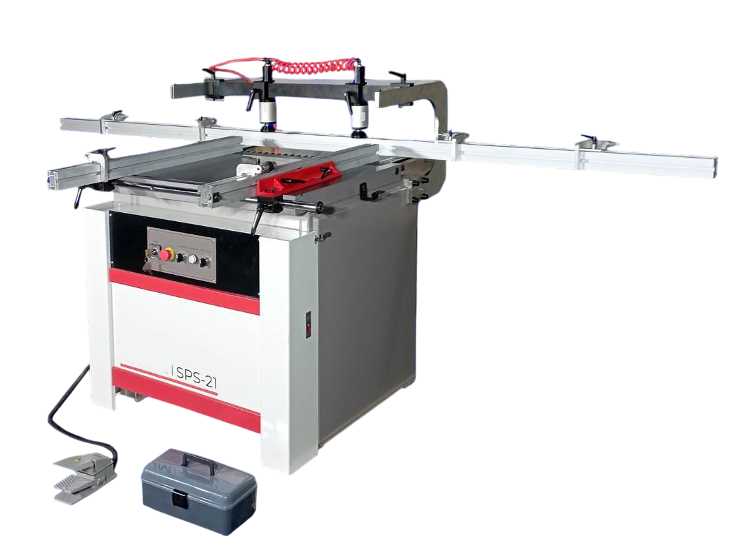 Траверса 21 шпиндель 1,5 кВт, 2800 об/минМакс. ширина 640 мм, 32 между осямиЛинейки 3 метра + 2х0,9 мм, 6 флажковПоложение траверсы 0-45-90 градусов. пневматика на положении и 2пневмоприжимаСтол 1100x400 ммСверлильно-присадочный станок SPS21