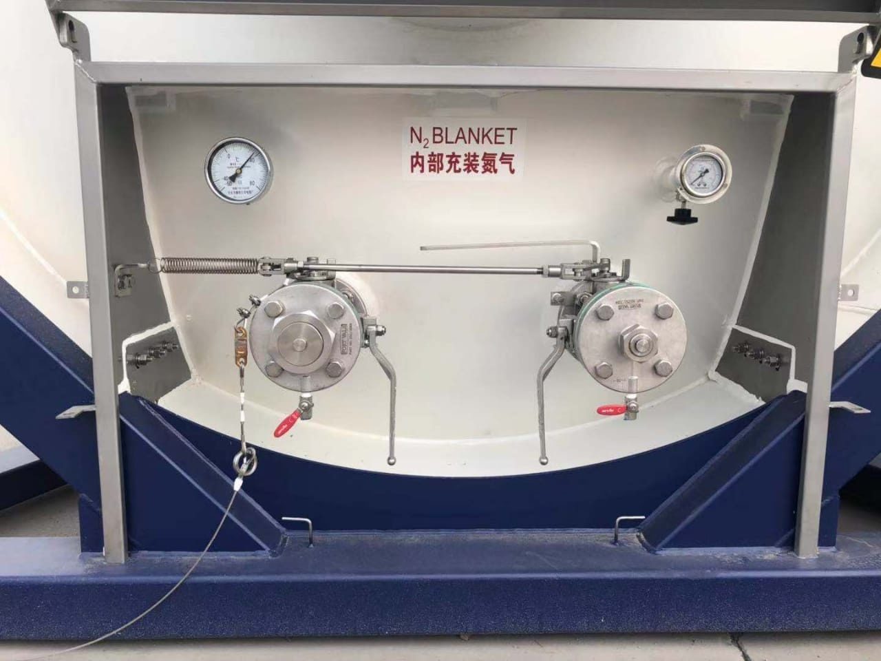 | Линия налива (слива) жидкой фазы | Состоит из: - Внутренняя линия диаметром 3 " уменьшенная до 2" (DN50) заканчивается в поддоне емкости; - Нижний клапан с ручным управлением 2 "Fort Vale; - Выпускной клапан 2 " (DN 50) шаровой кран Fort Vale из нержавеющей стали; - Продувочный клапан 1/4 "из нержавеющей стали; - Переходник SS 3 1/4 "АСМЕ" с пылезащитным колпачком, закрепленный на дополнительном фланцевом соединении; - Все внутренние трубопроводы из нержавеющей стали; - Выходной фланец и клапаны защищены балками рамы от корпуса и задней нижней направляющей. |