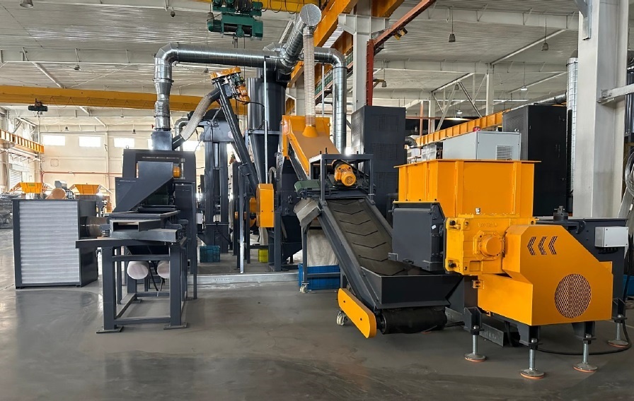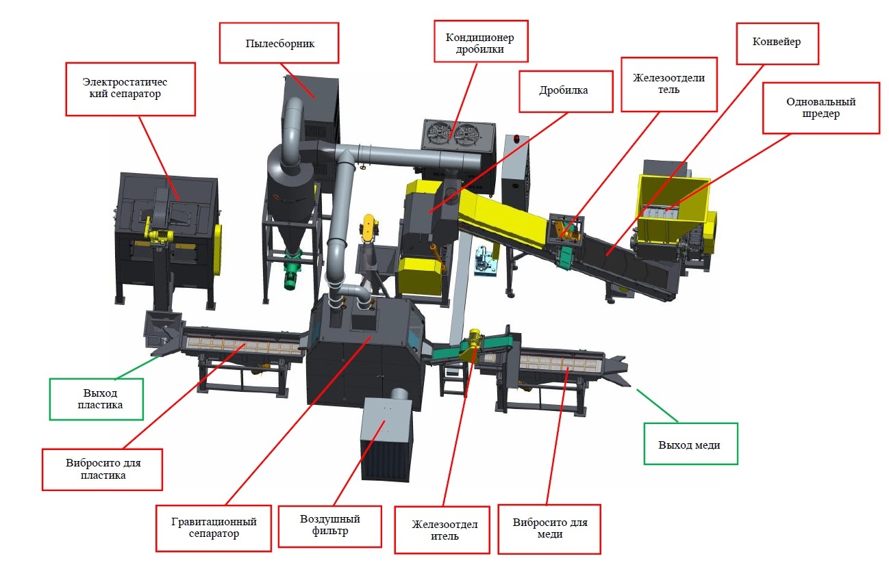 Линия состоит из одновального шредера, дробилки, гравитационного сепаратора, системы конвейеров, циклонов, системы фильтрации.