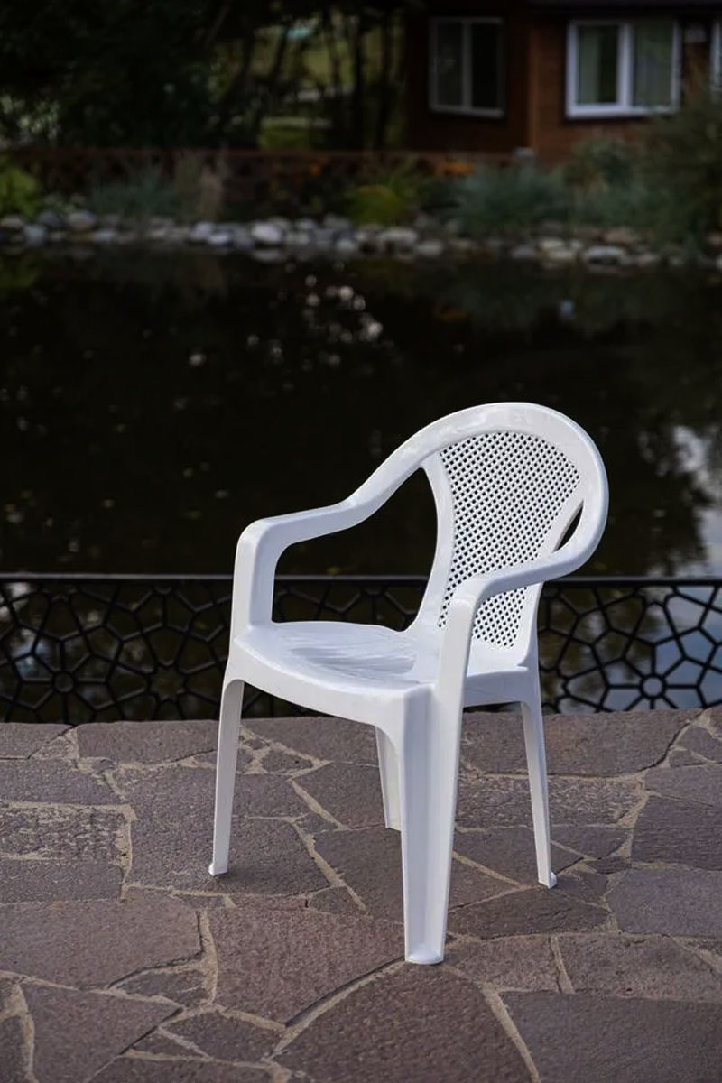 круглый стол; кресло, табурет, овощной ящик.