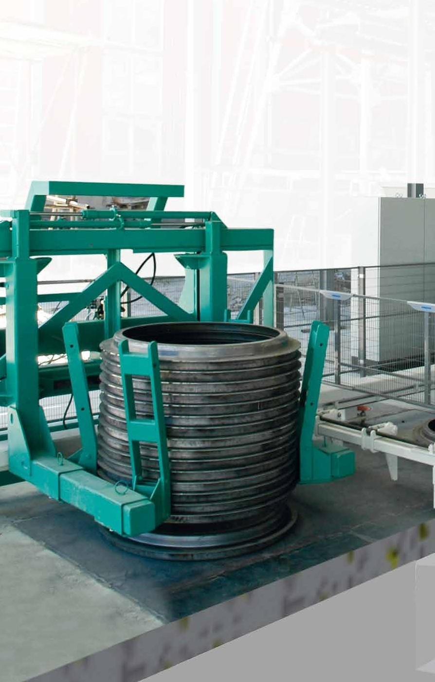 Для автоматической установки арматурных колец или арматурных каркасов доступна соответствующая система установки как для производства труб, так и для производства элементов колодцев.
