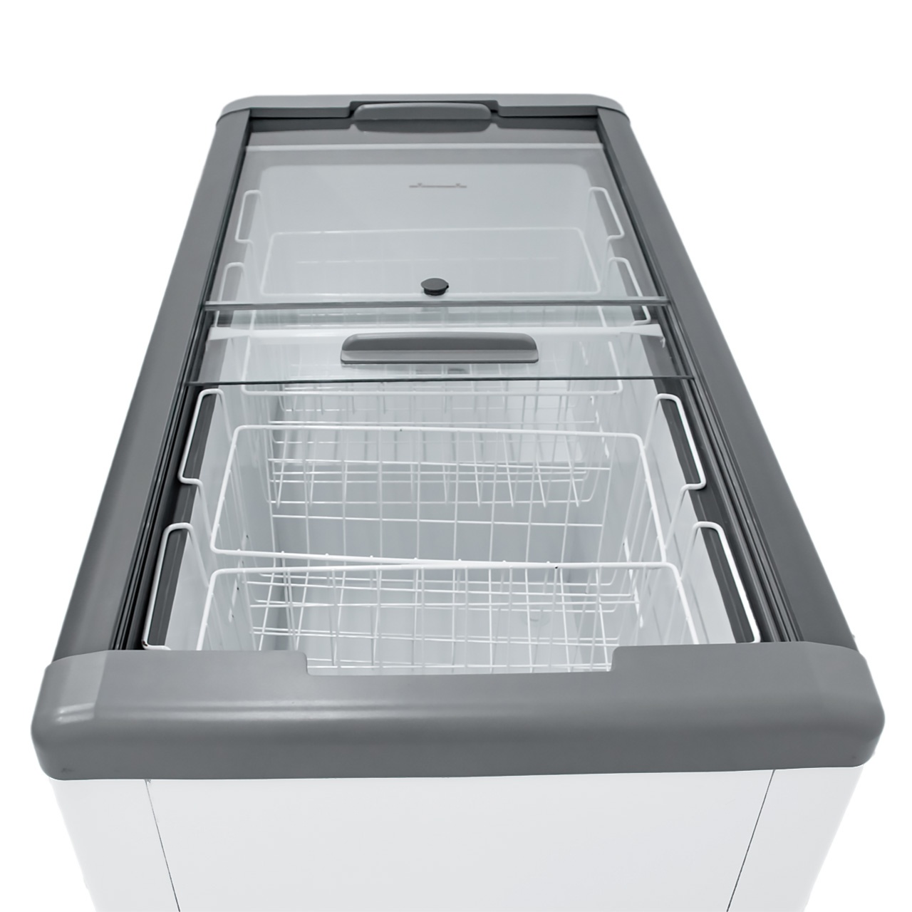 Ларь морозильный Frostor GELLAR FG 400 C – низкотемпературный ларь для заморозки, демонстрации и хранения различной пищевой продукции. Корпус ларя выполнен из прочной оцинкованной пластифицированной стали. Крышка прямая прозрачная из энергосберегающего закаленного стекла. Направляющие для стекол съемные. Материал теплоизоляции – пенополиуретан. Ларь вмещает в себя 4 проволочных корзины для удобства выкладки товара. Охлаждение статистическое, оттайка принудительная.