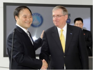 Глава СД китайского автоконцерна Geely Ли Шуфу и финансовый директор Ford Motor Co. Льюис Бут в штаб-квартире Volvo Car Corporation в Гетеборге во время продажи шведского автоконцерна в 2010 году.