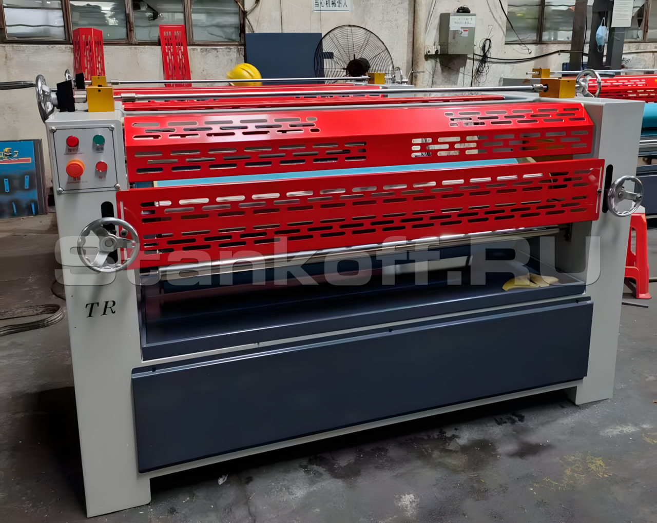 Станок используется для нанесения на поверхность древесно-стружечных плит, щитов из древесины, МДФ и т. п. соответствующих типов клея.
