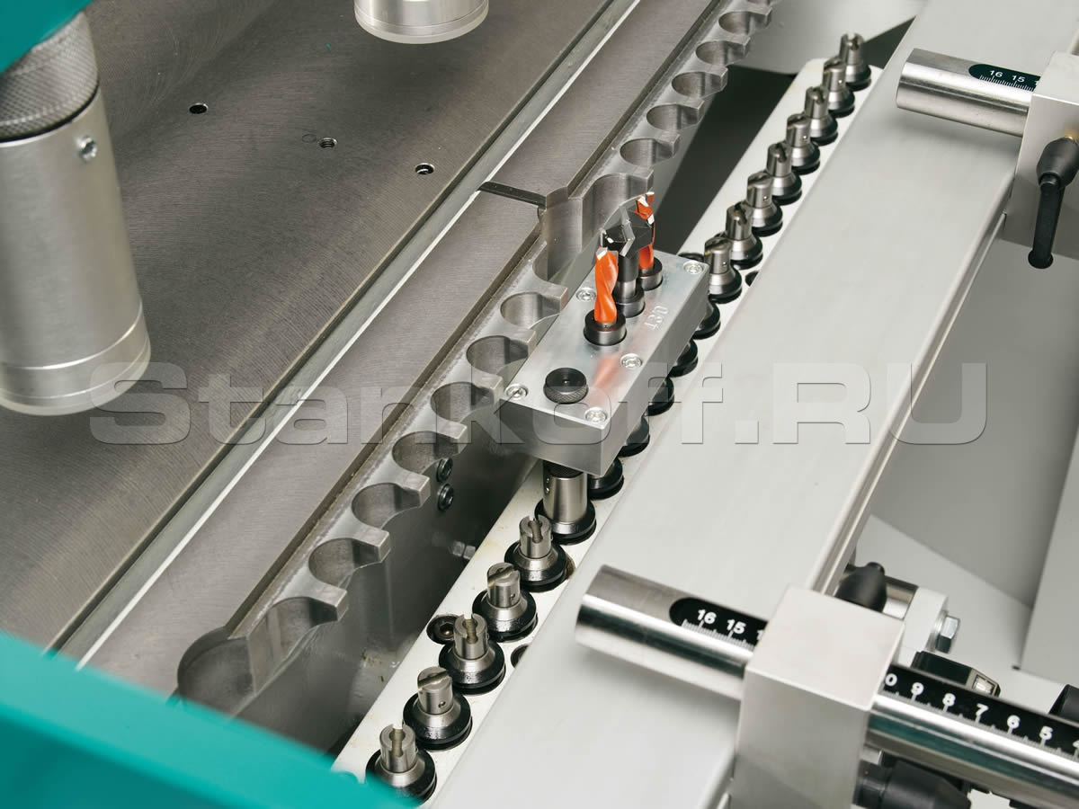 Конструкция шпиндельной головки предполагает использование широкого диапазона сверл различного вращения и длины, диаметром от 1,5 мм до 40 мм (сверла ф1,5 – 3 мм используются со специальным переходником). Это позволяет сверлить глухие и сквозные отверстия необходимой глубины и диаметра.