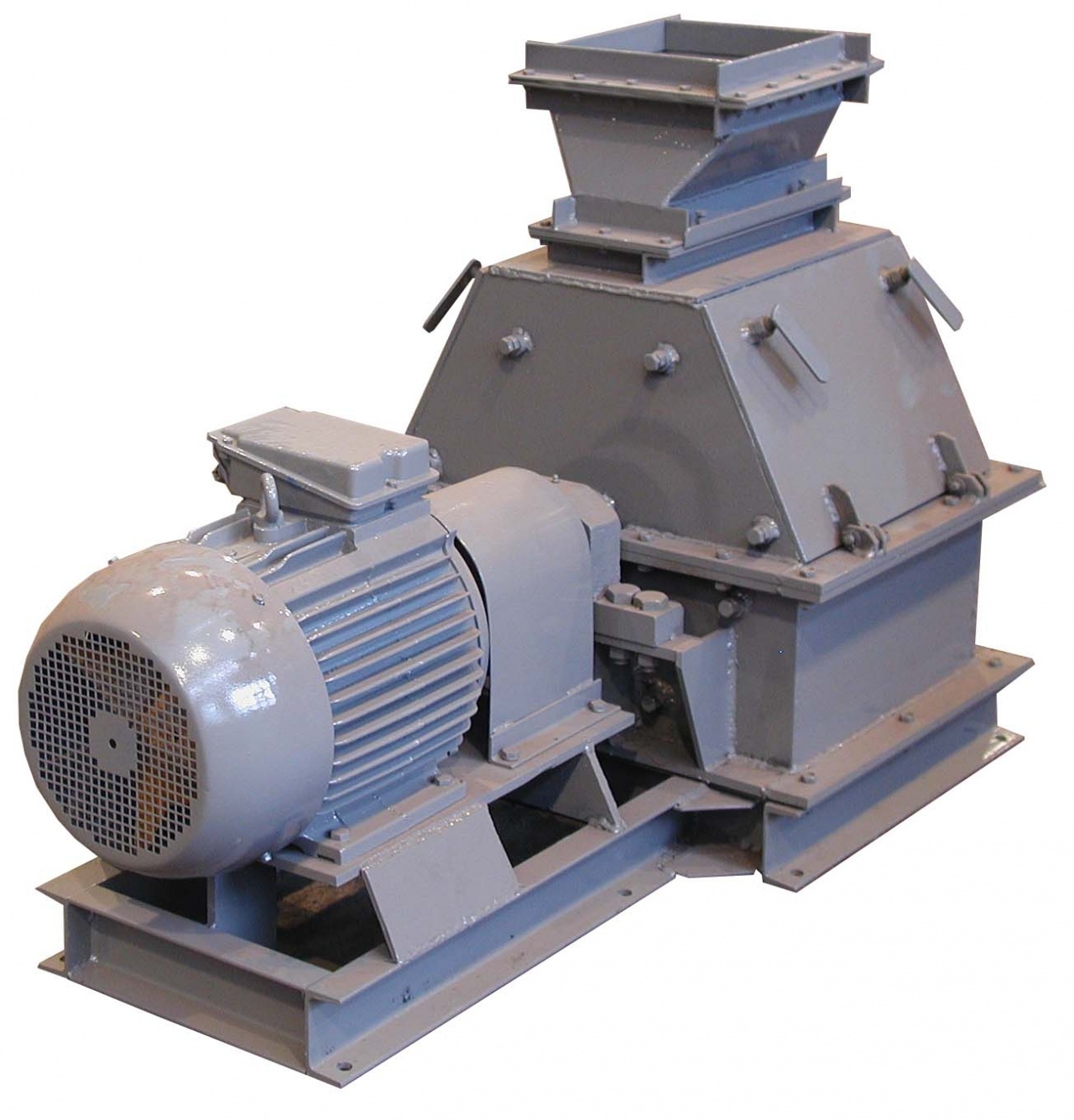 Продукт подается через приемный патрубок в крышке и, благодаря ударному воздействию вращающихся молотков, а также ударам частиц о деку, измельчается. Степень измельчения зависит от размера сит.