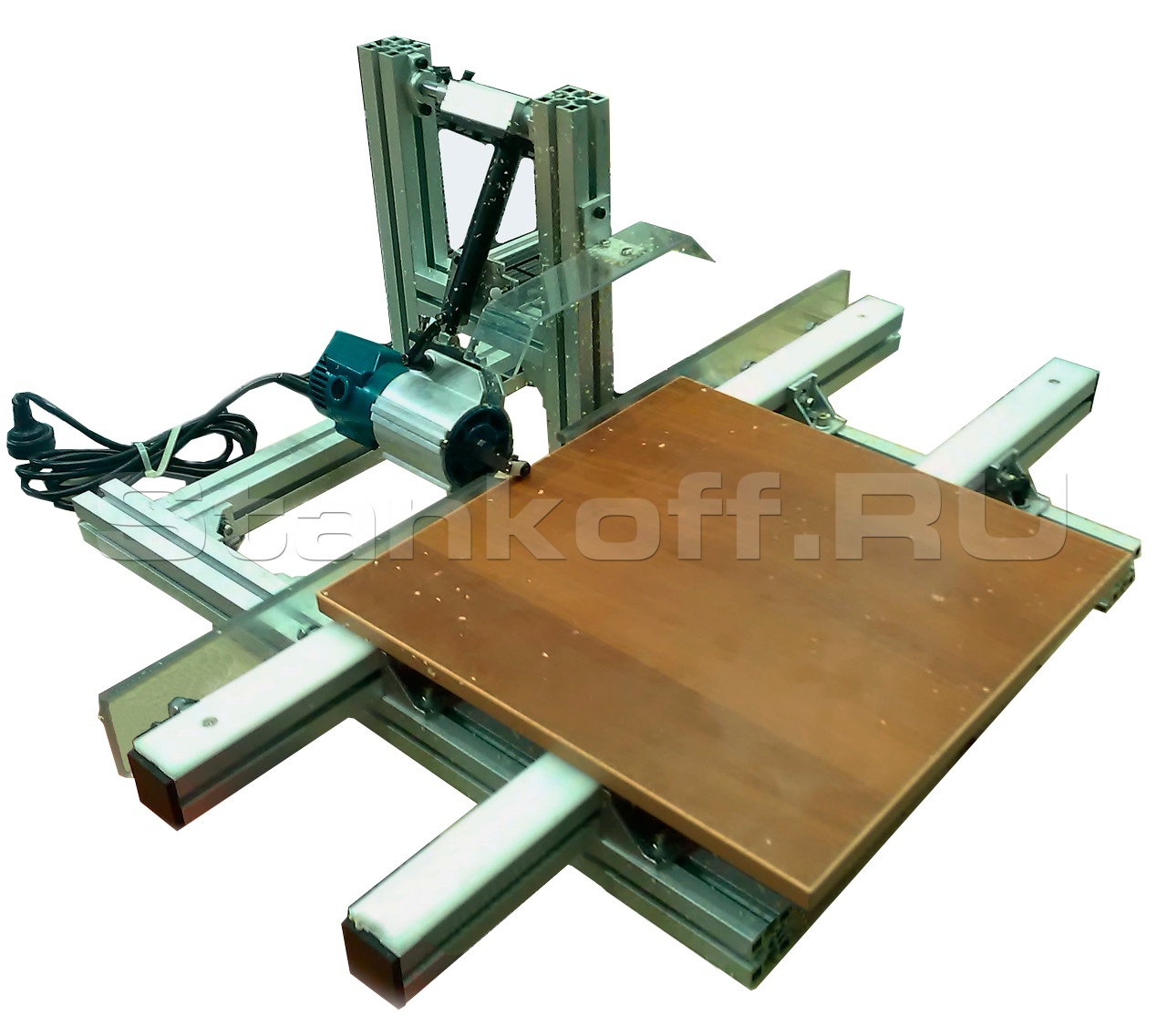 Фреза с помощью обкатного ролика повторяет контур заготовки. Система амортизации предотвращает падение фрезы после цикла фрезеровки. Система обдува не позволяет стружке накапливаться на заготовке.