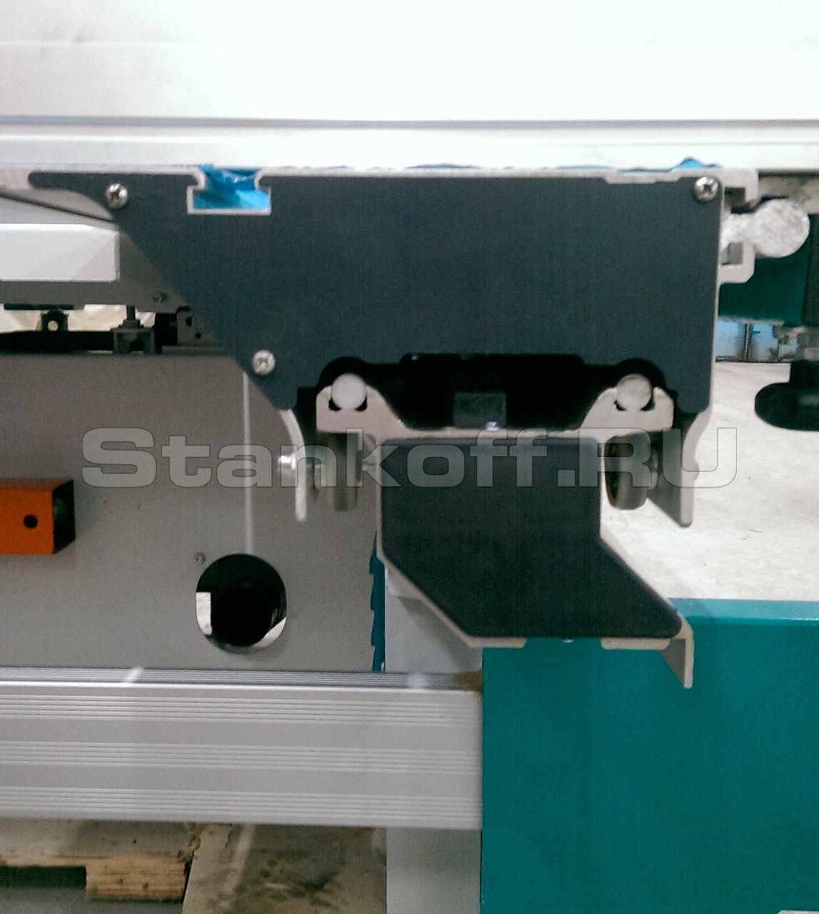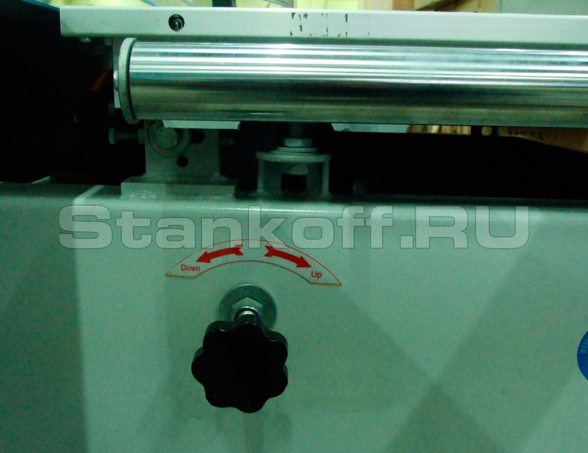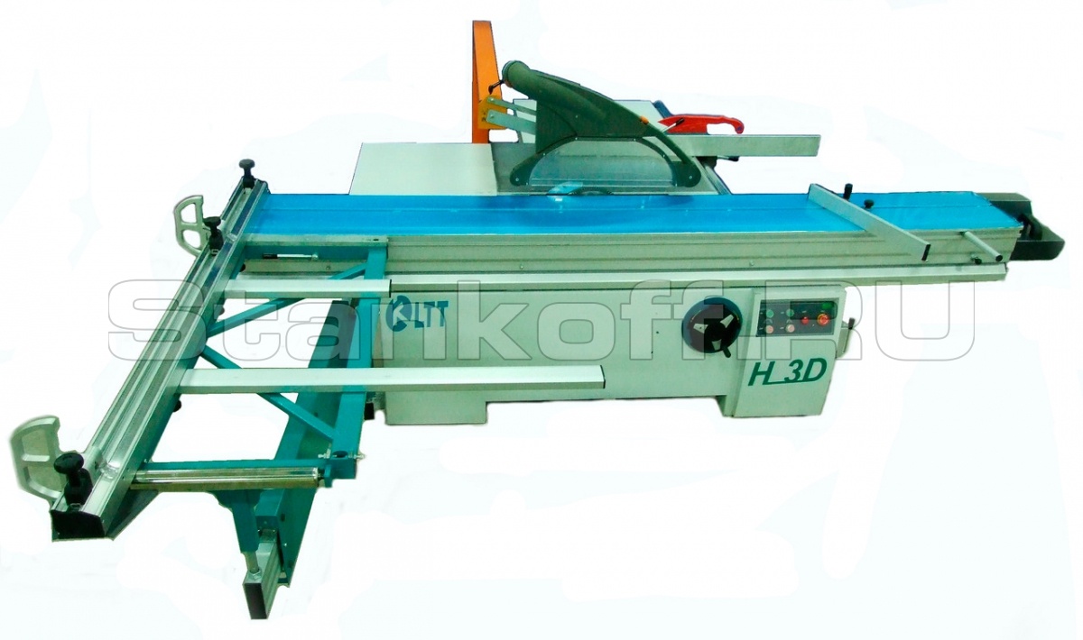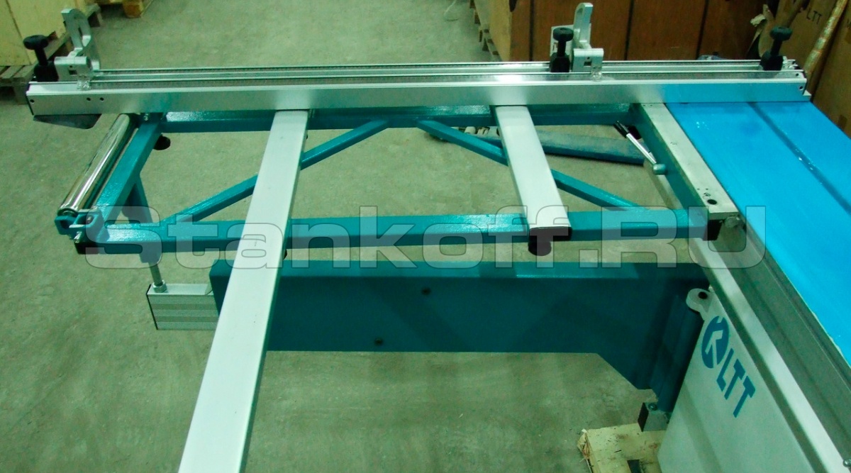 Длинная алюминиевая каретка и широкий поперечный стол позволяют устанавливать и перемещать относительно пильного механизма листы большого формата. Пильный механизм включает в себя два режущих узла основную пилу и подрезную пилу. Подрезная пила имеет попутное вращения относительно подачи заготовки и за счет предварительного реза позволяет раскраивать ламинированные листы ДСП без появления сколов.