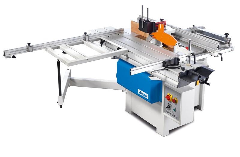 Каретка выполнена из алюминия, лёгкого и долговечного материала, и имеет размер 1660 мм на 315 мм. Точность реза обеспечивает алюминиевая линейка с двумя откидными упорами, фиксирующими заготовку. Наклонный распиловочный и подрезной узлы универсального комбинированного станка LM 30A способствуют идеальному распилу без сколов, который может осуществляться как под углом, так и прямо. Станок соответствует нормативам безопасности СЕ.