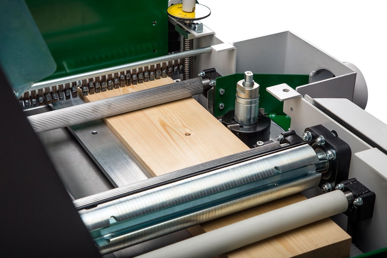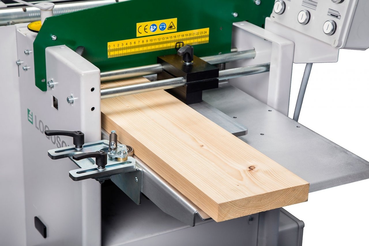 Различие в том, что DH410 работает с двумя фрезами вместо четырех. Четырехстороннее строгание выполняется двойным пропуском доски через станок, с первоначальной черновой обработкой доски и последующей доработкой до размеров 310 мм по ширине и 100 мм по высоте.