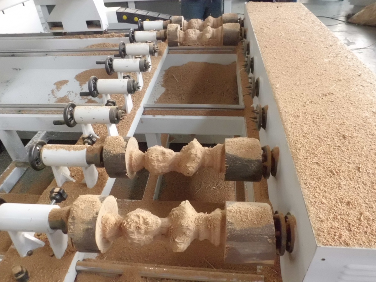 ЧПУ фрезерный станок по дереву предназначен для высококачественного фрезерования и гравирования одновременно восьми изделий, из круглых заготовок (а также бруса квадратного сечения) и получения высококачественных и высокохудожественных элементов со сложной резьбой (балясины , столбы , колонны), элементы мебели с имитацией ручной резьбы ( гнутые ножки , круглые ножки , декоративные элементы и т.п.), оружейные приклады, сувенирная продукция и многое другое.