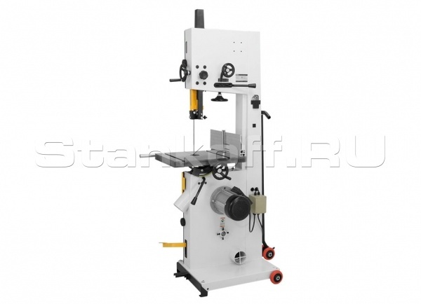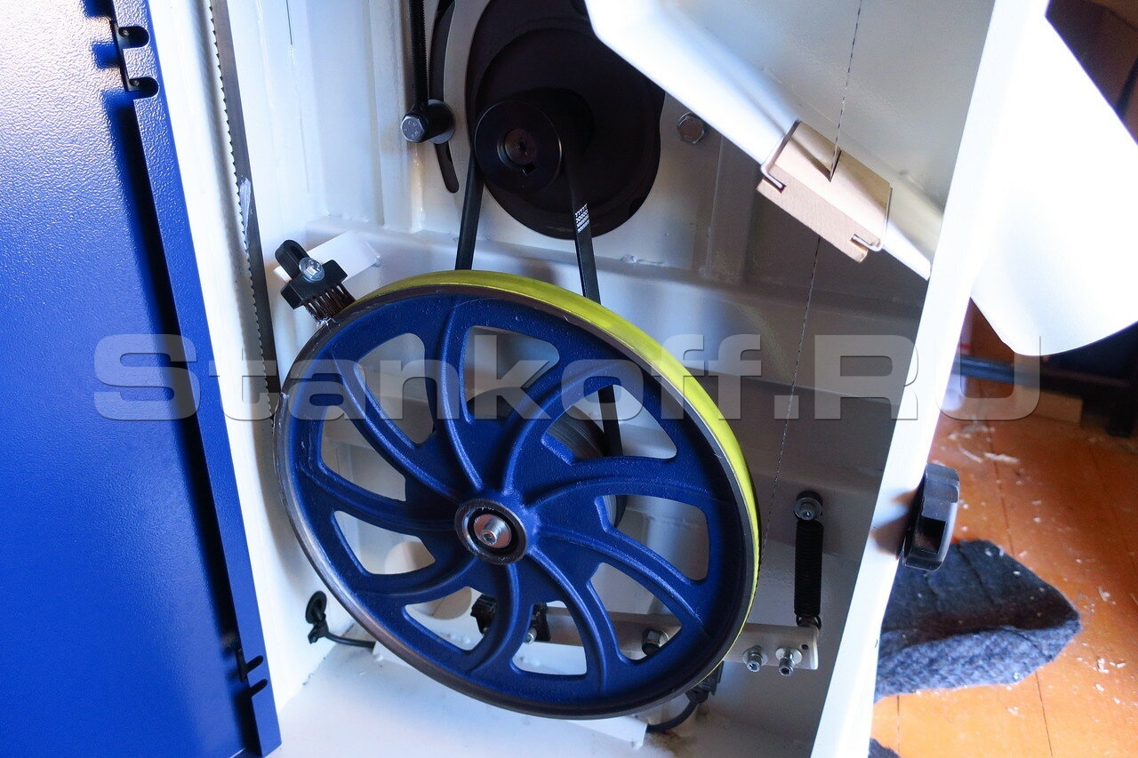 - В качестве обрабатывающего инструмента станок использует высокопрочное ленточнопильное полотно длиной 3600 мм, базирующееся на шкивах диаметром 355 мм. Ширина ленты может варьироваться от 5 до 25 мм. Скорость вращения полотна достигает 1290 м/мин, что дает станку возможность производить высококачественный распил высотой до 355 мм. Ленточное полотно комплектуется системой верхних и нижних упорных устройств, оснащенных функцией высокоточной настройки, что позволяет точно и надежно фиксировать ленту для исключения ее смещения в процессе движения в обоих направлениях.