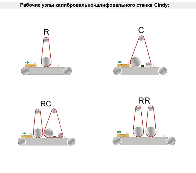 - 2 типа рабочих агрегатов: калибровальный (R) и шлифовальный (С). Контактный калибровальный вал тип R достаточного диаметра для большого съема материала за один проход. Комбинированный шлифовальный узел С – контактный обрезиненный вал с утюжком – комбинация для удаления волн от шлифовальной ленты. У некоторых производителей калибровалок такие типы шлифовальных узлов могут называться RK, RT, T, K, KRT, KRR, и т.д.