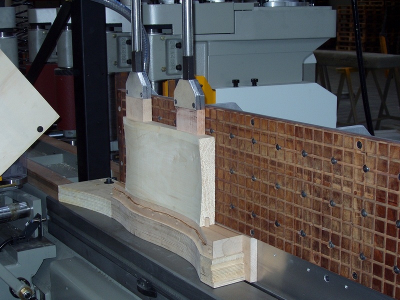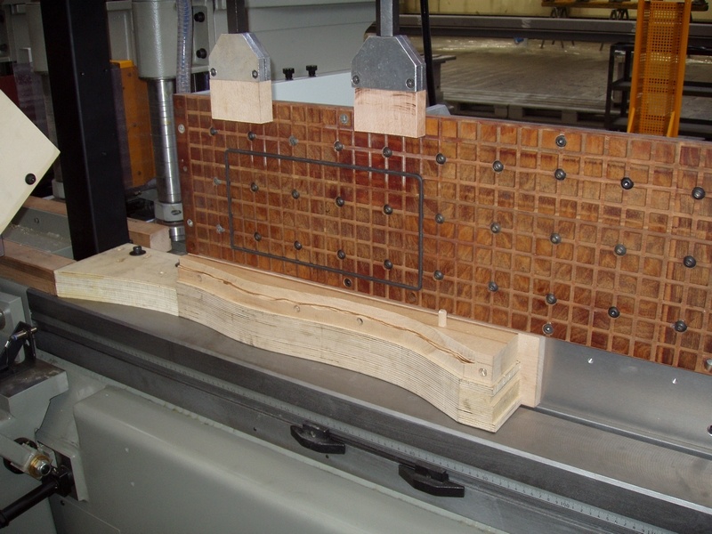 На станине также установлены регулируемые выравнивающие пластины. - Алюминиевая структура стола имеет ребра жесткости для того, чтобы противостоять давлению прижимов. Перемещение подвижного стола осуществляется по линейным направляющим на подшипниках скольжения. Точность хода стола – максимум 0,03 мм в максимальных точках прогиба. Вдоль оси стола сделаны отверстия для фиксации шаблонов. Эти отверстия также используются как нулевые точки для определения положения рабочих групп станка. Это дает возможность оператору правильно уложить заготовки на поддерживающие суппорты. Также копировально-фрезерный станок укомплектован регулируемыми упорами с линейками для облегчения позиционирования криволинейных деталей.