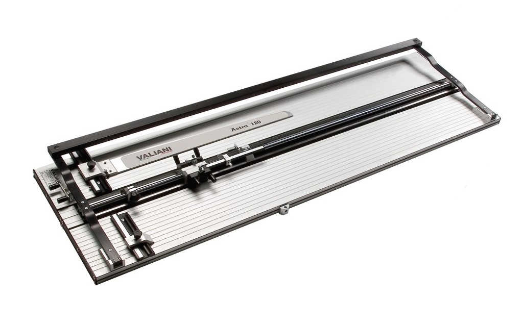Настольный станок для вырезания паспарту Valiani Astra 120/150 вышел на новый уровень. Astra выпускается двух размеров – с длиной реза 1250 мм и 1550 мм, и режет картон для паспарту различной толщины. В стандартную комплектацию входят магнитные стопоры, измерительные стопоры, удобный держатель лезвия и правое измерительное крыло. Режущая головка скользит на четырех шарикоподшипниках по двум прочным, не подверженным деформации закаленным стальным дорожкам, которые постоянно очищаются двумя маленькими кисточками, расположенными под ними.