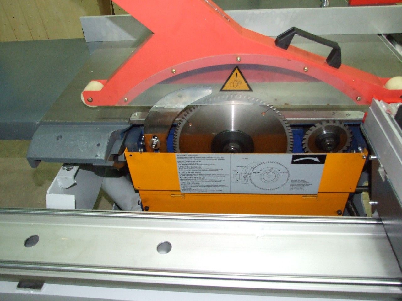 Пильный механизм включает в себя два режущих узла основную пилу и подрезную пилу. Подрезная пила имеет попутное вращения относительно подачи заготовки и за счет предварительного реза позволяет раскраивать ламинированные листы ДСП без появления сколов.