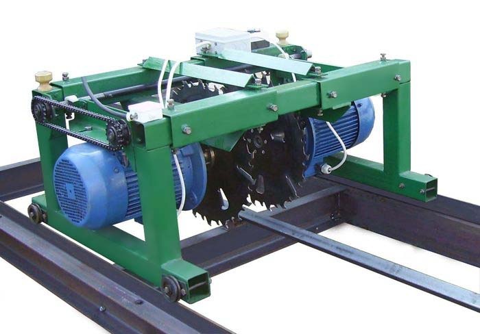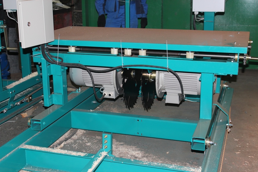 Станок «СБ-25» предназначен для получения бруса или лафета из тонкомера. На станке установлены две дисковые пилы диаметром 560 мм. Установка ширины пропила выполняется при помощи винтового механизма.