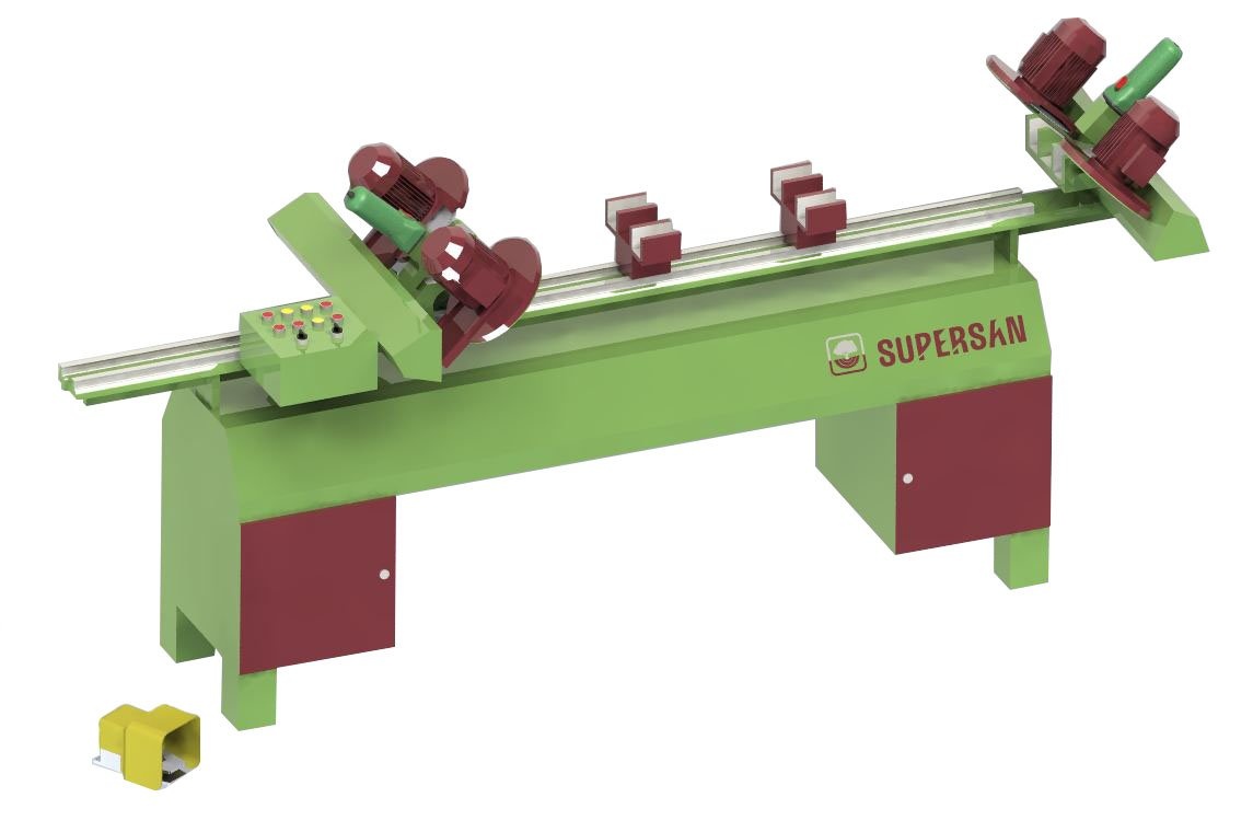 Высокопроизводительный станок, имеет 4 отрезных диска и 2 фрезерных узла. Пилит под углом 45 и фрезерует 2 паза под шпонку. Обрабатывает 2 заготовки с 2-х сторон за один производственный цикл. Оснащён пневматическими приводами.