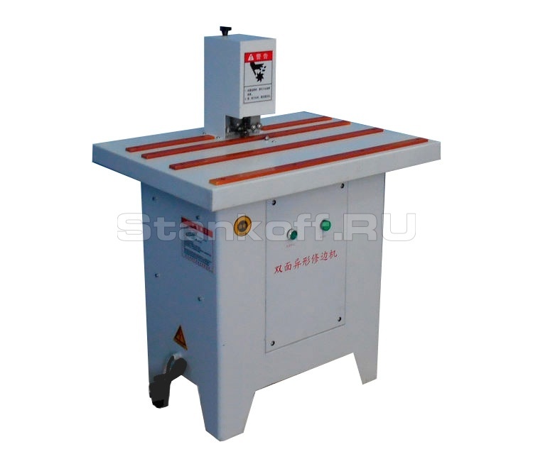 Снятие свесов производится двумя фрезами, приводящимися в движение от двух высокочастотных электродвигателей итальянского производства. На станке установлены ручки для регулировки толщины материла и настройки точного радиуса снимаемой кромки.