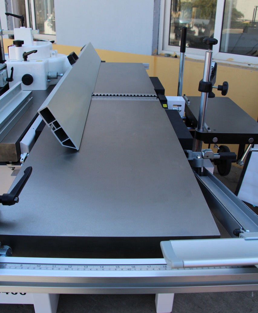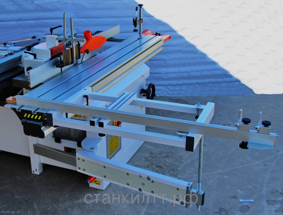 - Для зарезания шипов и пиления поперек волокон и под углом служит пильная каретка, которая имеет большой навесной стол и позволяет раскраивать не только массив но плитные материалы.