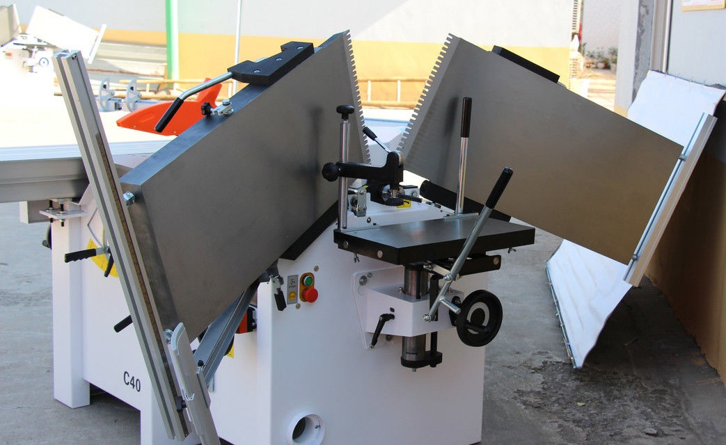 - Пильный узел включает не только основную но и подрезную пилу и имеет возможность наклона на 45о, что даёт возможность работы с ламинированными заготовками и производства мебели.