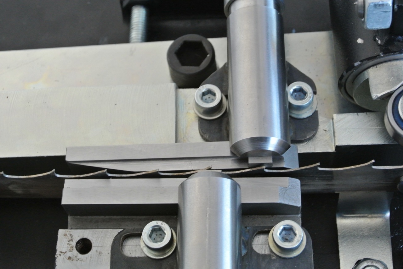 В зависимости от вида пилы мы устанавливаем способ и величину разводки, например, в пилах типа W-M с удлиненной пазухой мы раздвигаем два зуба, а третий обходим, оставляя прямым. В этом цикле одновременно разводятся два зуба, а лента переставляется на очередные три.