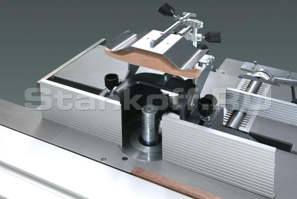 - Дополнительная фронтальная рабочая поверхность, оснащенная опорной конструкцией, позволяет обрабатывать заготовки увеличенных габаритов (длиной до 2100 мм), точность базирование заготовок обеспечивается измерительным устройством, оборудованным двумя упорными механизмами;