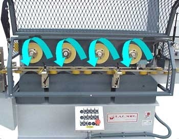Станок имеет систему подачи заготовок с помощью нижних приводных стальных роликов и верхних обрезиненных приводных роликов. Высокая скорость подачи до 80 м/мин обеспечивает повышение производительности станка. Скорость подачи регулируется бесступенчато с помощью инвертора. Прижим заготовок верхними роликами осуществляется от пневматики с независимой регулировкой усилия прижима рукоятками на панели управления.