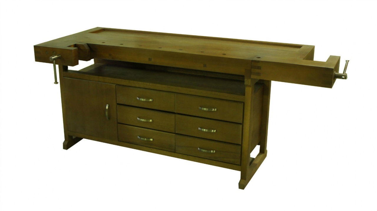 Выполнены в традиционном классическом стиле с использованием твердых пород древесины и оборудованы двумя подвижно-зажимными коробками с червячными металлическими винтами, подвижными клиньями для обработки длинных заготовок и лотком для заготовок и инструментов.