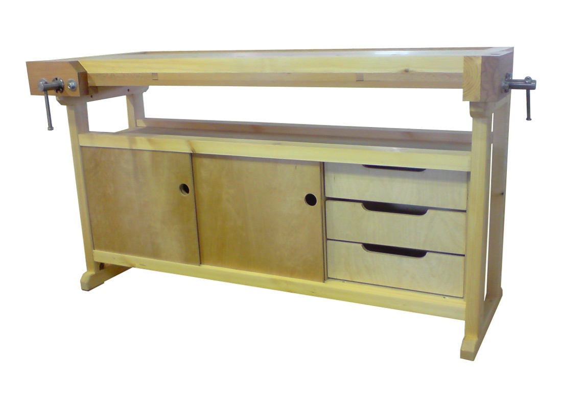 Несущие конструкции тумбы «Практик» выполняются из сосны, а дверцы, полки, ящики, стенки и перегородки — из березовой фанеры. Собранная тумба «Практик» — это прочное и устойчивое основание для верстака.
