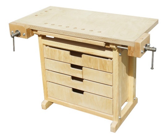 Столешница верстака «Маленький мастер» выполнена из ударопрочной, многослойной березовой фанеры толщиной 35-40 мм, позволяющей закрепить разные приспособления и слесарные тиски.