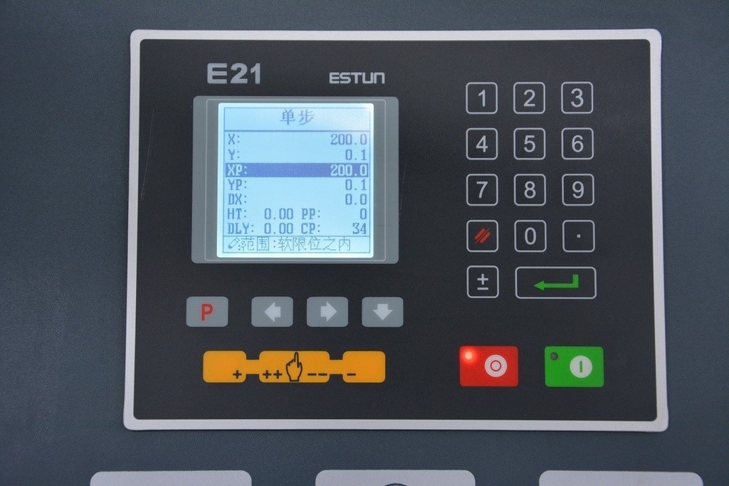 Станок оснащен двухосевым контроллером Estun E21. Управление по оси Y осуществляется контроллером путем задания положения механического упора, находящегося в гидроцилиндре. Это обеспечивает высокую точность и стабильность результата. Управление по оси X так же осуществляется контроллером, за что отвечает привод на базе мотор-редуктора с обратной связью и высокоточной ШВП с направляющими. Непосредственно правление приводами по осям производится частотным преобразователем.