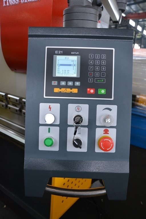 Справа от траверсы, на поворотном кронштейне, расположена панель управления. На панели управления расположен контроллер Estun E21 (память на 40 программ по 25 гибов в каждой программе), на котором отображаются заданные и текущие положения рабочих органов по осям.С панели управления можно задать как координату «Y» (погружения ножа в матрицу - угол гиба) так и координату «Х» (перемещение ограничителей подачи листа на нужную позицию). Также на панели управления расположен переключатель режима работы (толчковый/ непрерывный/ автоматический) и таймер установки времени задержки в нижней точке.
