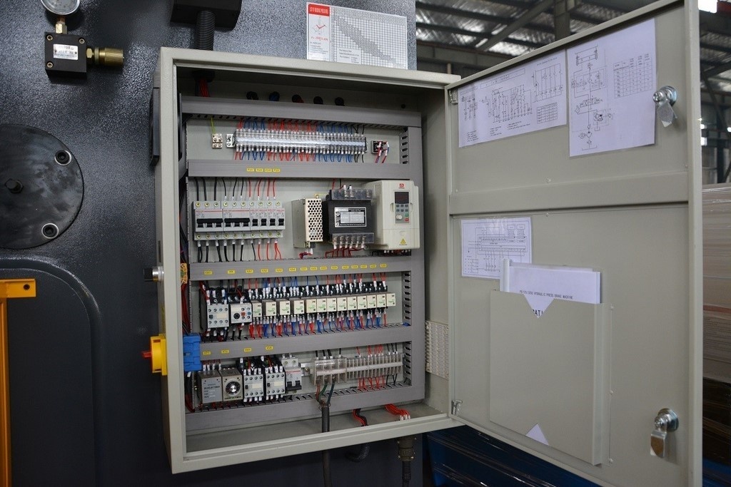 Станок оснащен двухосевым контроллером Estun E21. Управление по оси Y осуществляется контроллером путем задания положения механического упора, находящегося в гидроцилиндре. Это обеспечивает высокую точность и стабильность результата. Управление по оси X так же осуществляется контроллером, за что отвечает привод на базе мотор-редуктора с обратной связью и высокоточной ШВП с направляющими. Непосредственно правление приводами по осям производится частотным преобразователем.