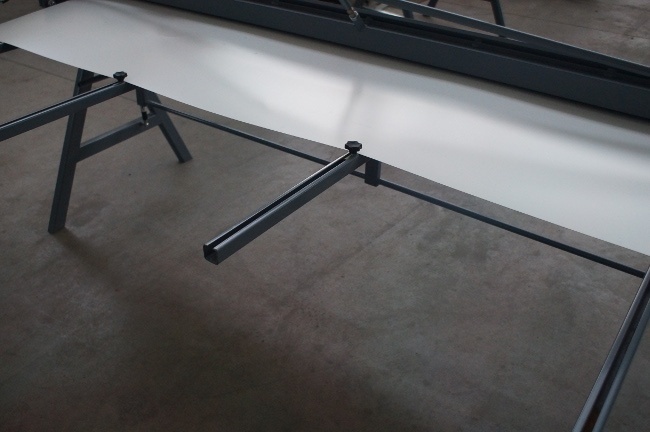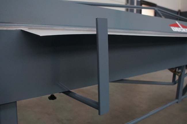 Имеет задний и передний столы поддержки металлического листа с ограничителями и удобной линейкой.
