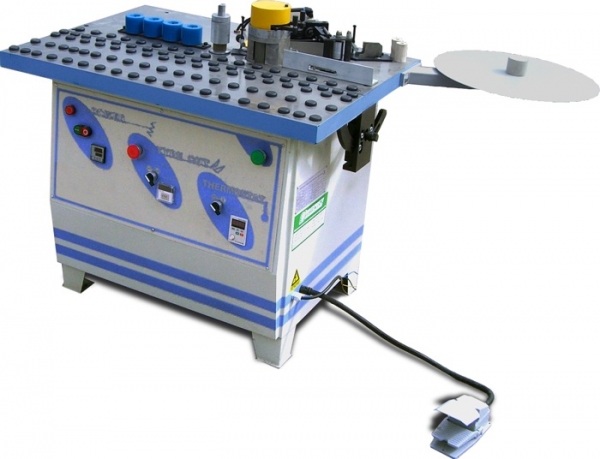 Прямолинейные и криволинейные детали, кромка 0,4-3 мм, обрубка кромки (пневматика); скорость подачи кромочного материала 1-14 м/мин, регулировка стола по высоте, нижний клеевой бачок, 200 кг