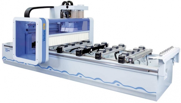 Обрабатывающий центр с электронным управлением для выполнения операций фрезерования и сверления для индивидуального производства мебельных деталей, обработки массивной древесины и аналогичных материалов.