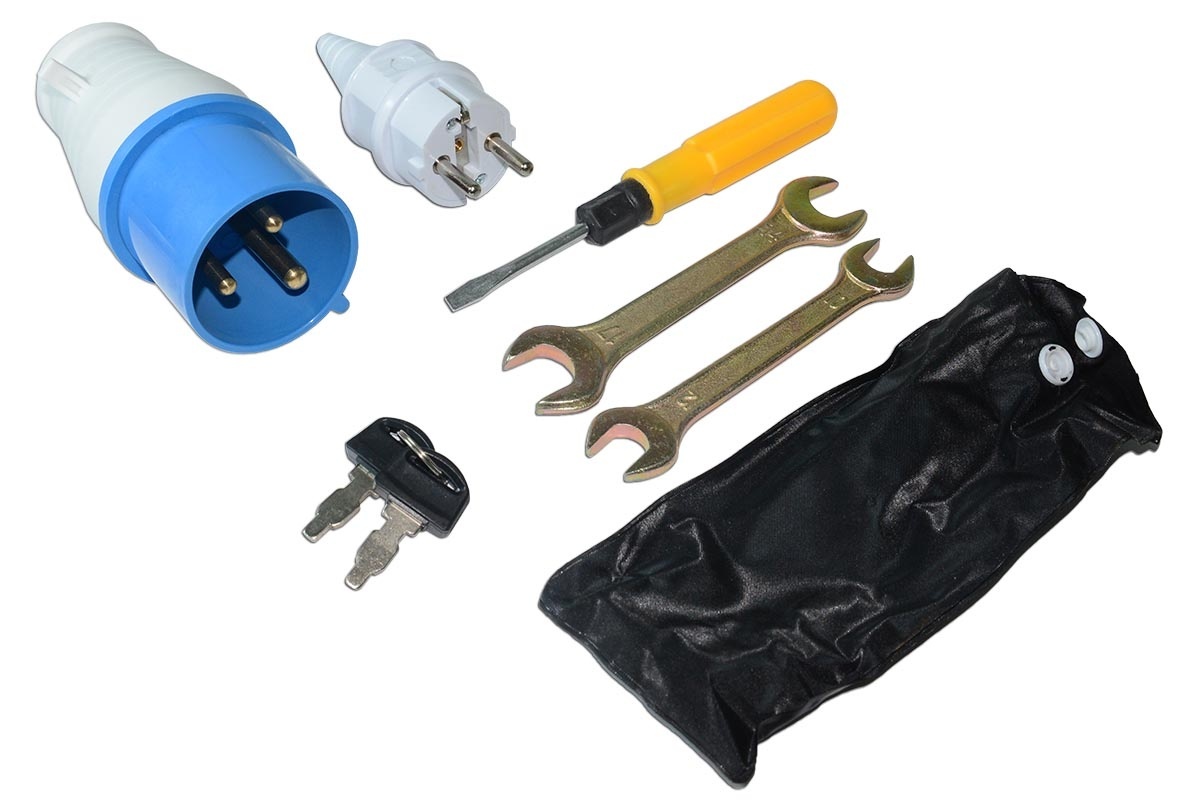 - Набор инструментов в комплекте: отвертка, ключ рожковый 10х12, ключ рожковый 14х17, ключ зажигания (2 шт.)