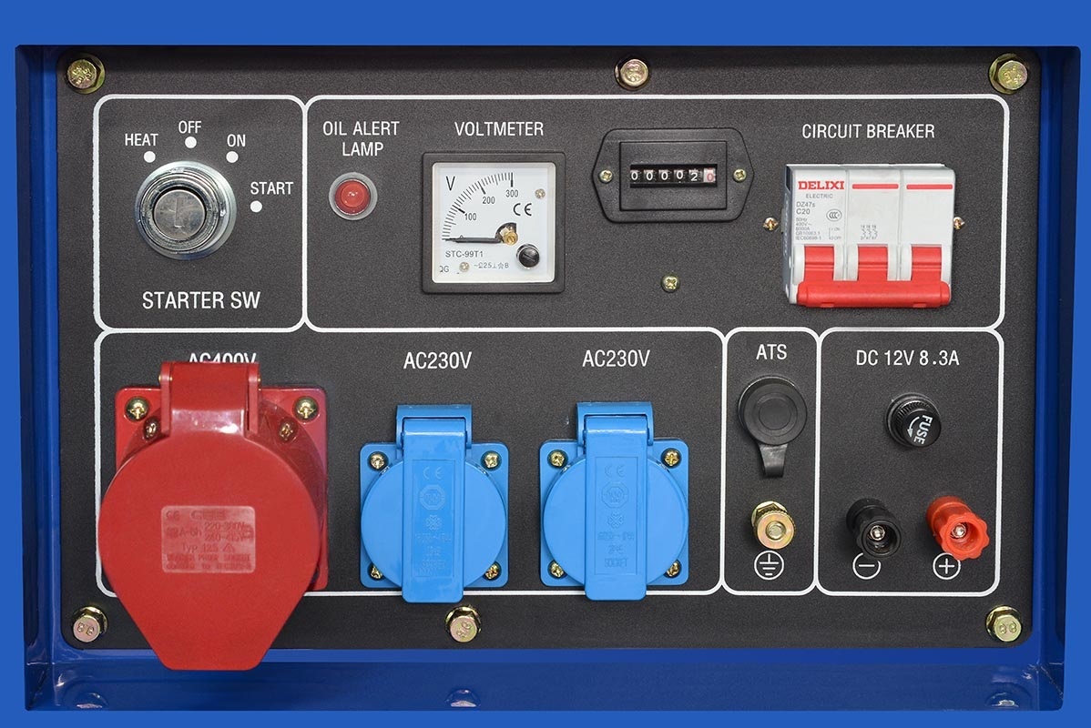 - Панель управления содержит вольтметр для отображения напряжения, счетчик моточасов, а также, индикатор уровня масла и индикатор топлива, автомат защиты