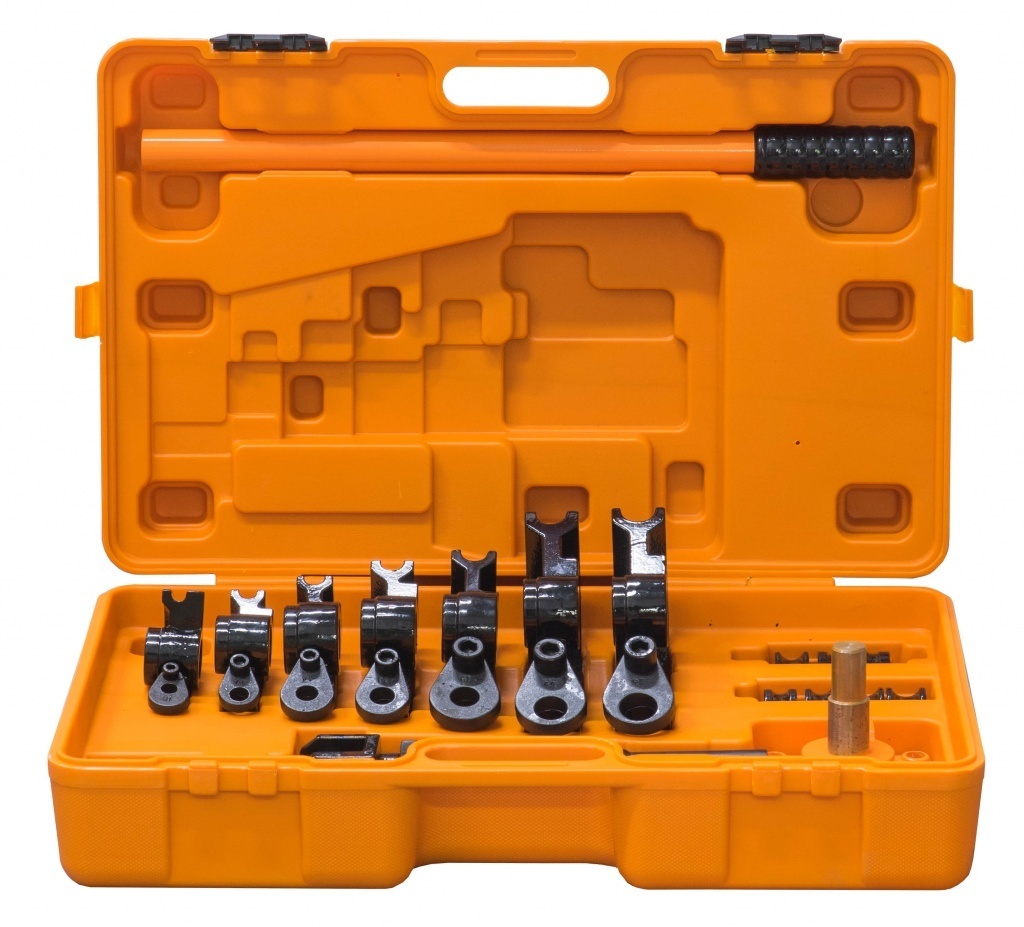 - Подходит для работы с трубами из цветных материалов, стали в том числе и нержавеющей стали (диапазон труб 9,5-25,4мм). Семь наборов роликов.