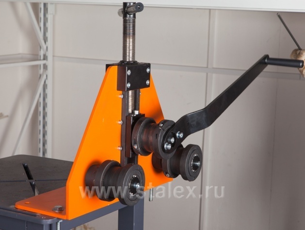 Stalex TG-50 – механический профилегиб с наружными роликами, удобен при работе с заготовкой «колесо» или «круг». Рабочие ролики легко выдвигаются с валов для съёма получаемой заготовки. Предназначен для гибки труб профильного и круглого сечения из металла или другого материала по заданному радиусу, методом прокатки.