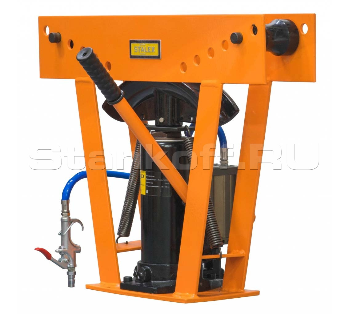 Пневмогидравлический трубогиб HB-12Q способен работать в двух режимах – ручном режиме (как мобильная модель на строй площадке) и пневматическом режиме управляемого от воздушного компрессора с мощностью двигателя 3 л.с. (что увеличивает его производительность и сводит к минимуму усилие работника). Гибка производится в одной плоскости, макс. угол гибки 90°. Модель усилена гидравлическим приводом, что позволяет монтажнику прикладывать меньше усилий при гибки стальных труб по сравнению с механическими трубогибами, и затрачивать на гибку гораздо меньше времени. При необходимости трубы макс. диаметров нужно набивать песком. При использовании трубогиба риск сплющивания или излома минимален, кроме того, уменьшается потребность в стыковочных элементах – отводах и фитингах, поэтому прокладка трубопровода становится более экономичной.