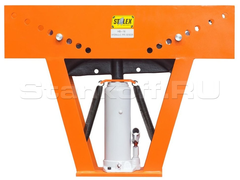 Тип станка – ручной гидравлический отличен от других вариантов ручных трубогибов тем, что его привод усилен гидравликой. Это позволяет монтажнику прикладывать меньше усилий при гибке стальных труб, и затрачивать на гибку гораздо меньше времени. Модель HB-16 продавливает заготовки при помощи гидравлической направляющей, с восемью сменными рабочими опорами. Помимо восьми рабочих опор станок имеет две горизонтальные опоры, устанавливаемые в отверстия для регулировки радиуса гиба. Трубогиб имеет два рабочих положения вертикальное и горизонтальное. Для работы в горизонтальном положении предусмотрены опорные ножки на стальном корпусе.