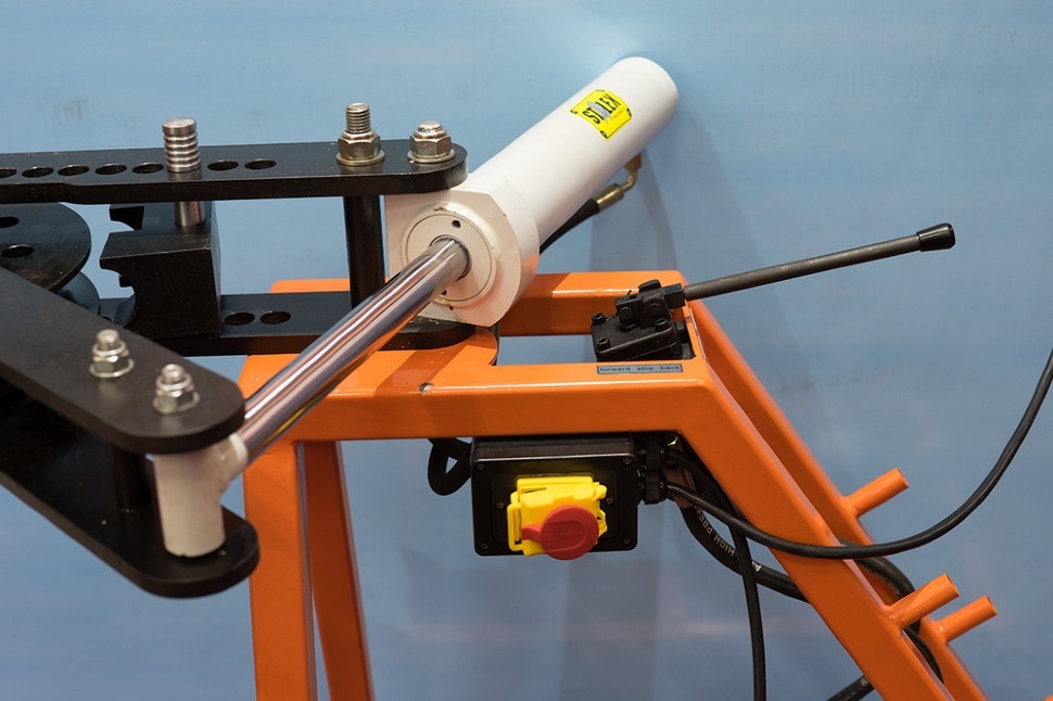 Гидравлический трубогиб HTB-1000 предназначен для изгибания круглых труб из металла или другого материала по заданному радиусу. Удобное управление гидроцилиндром и компактная гидравлическая насосная станция позволяют быстро производить гибку на нужный угол. Продуманная простая система рычагов, приводимая в движение гидравлическим цилиндром, развивает большое усилие гибки. Гибка трубы происходит вокруг штампа-шаблона, что обеспечивает точность изгиба трубы на заданный угол и с заданным радиусом. Максимальный угол гиба 0 - 120°, возможен гиб 0 - 240° на дополнительных штампах. Стандартный набор штампов позволяет изготавливать множество вариантов гибки труб различной конфигурации и в разных плоскостях.